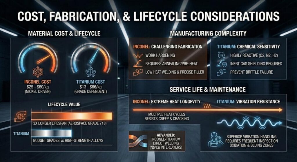 Mechanically, Titanium is selected for its fatigue resistance in cyclic loading at lower temperatures. Inconel is prized for its high yield strength, such as 517 MPa for Grade 625.